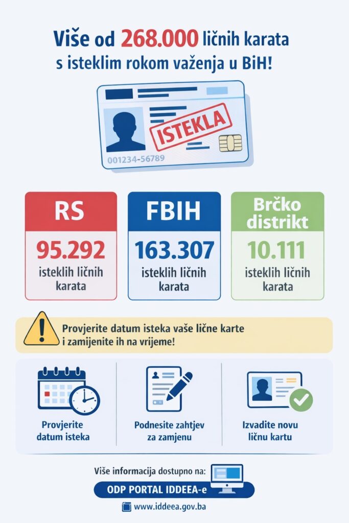 Prema podacima ove institucije, najveći broj ličnih karata kojima je istekao rok važenja zabilježen je u Federaciji BiH, gdje ih je evidentirano 163.307. U Republici Srpskoj taj broj iznosi 95.292, dok je u Brčko distriktu BiH registrovano 10.111 ličnih karata sa isteklim rokom važenja.